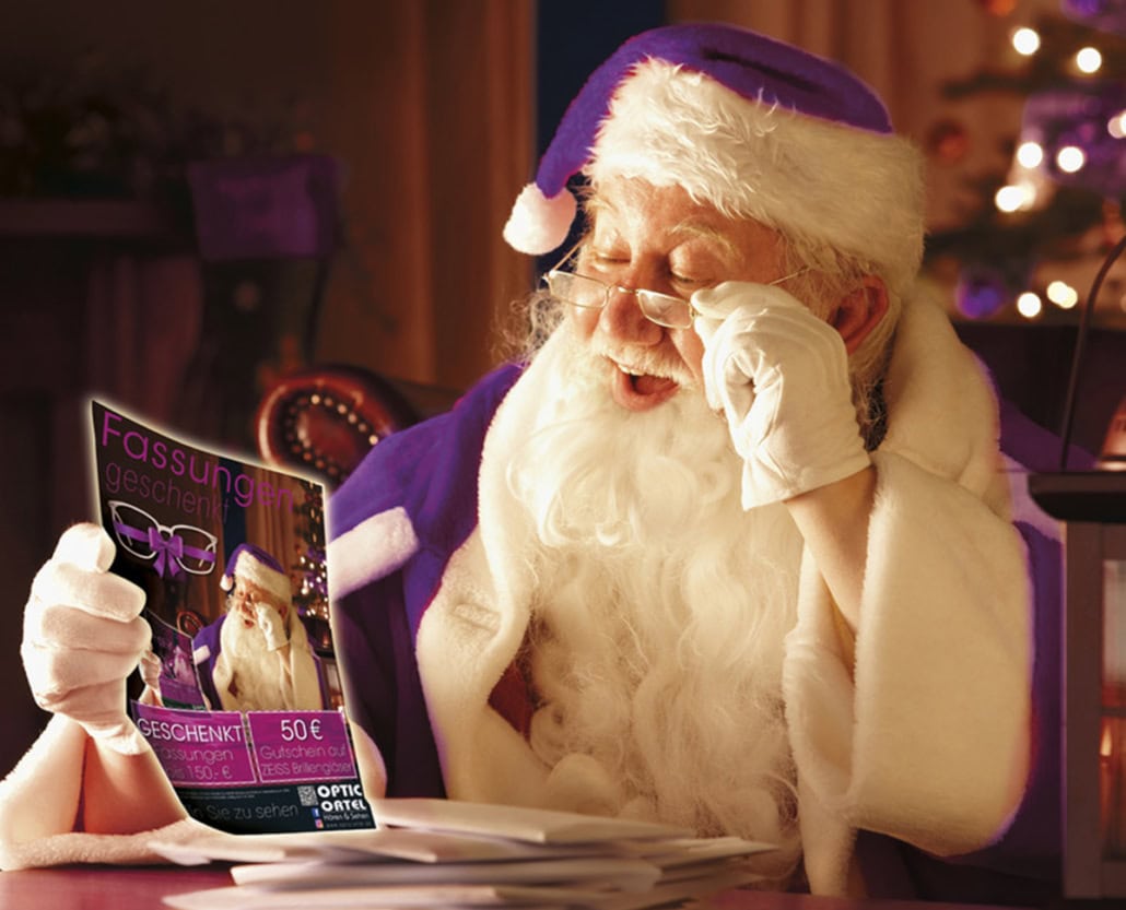 Der Weihnachtsmann hat schon ein Auge auf unsere Weihnachtsaktionen geworfen – und das nicht ohne Grund: Fassungen im Wert von bis zu 150 € geschenkt und einen 50-€-Zeiss-Gutschein für Brillengläser gibt’s obendrauf.